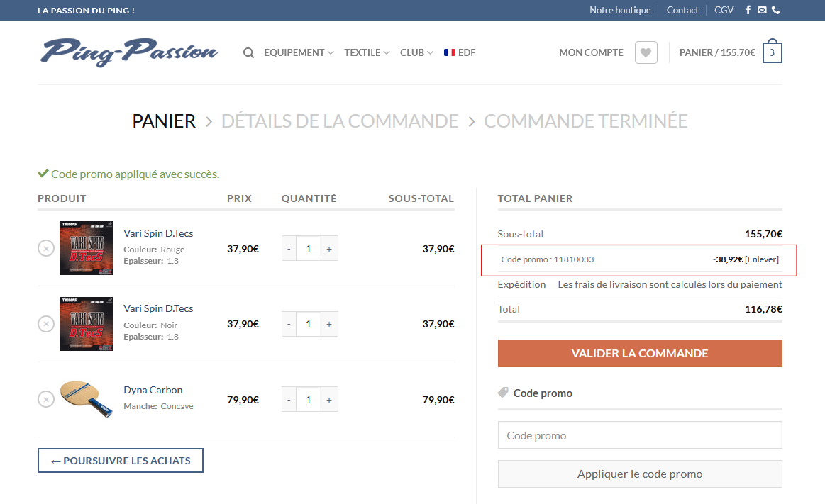 Pour bénéficier de cette réduction, il vous faut rajouter le code "11810033" au niveau de la rubrique "Code promo" (en rouge sur la droite de la capture d'écran) :